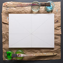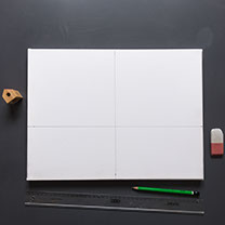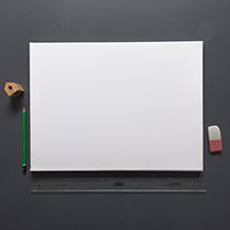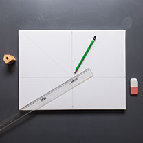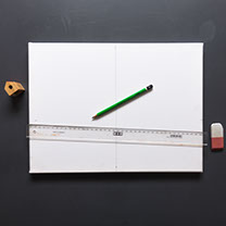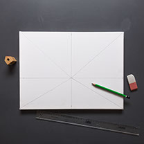 Trek eerst een horizontale lijn met een liniaal op het witte vlak. Dat is je horizon. Bepaal nu een verdwijnpunt op de horizonlijn. Die kan maar hoeft niet precies in het midden te zijn. Vanuit je verdwijnpunt trek je lijnen naar de hoeken van je doek. Ziezo, nu heb je jouw perspectieflijnen getekend voor je schilderij.