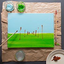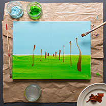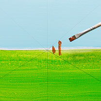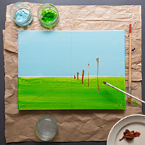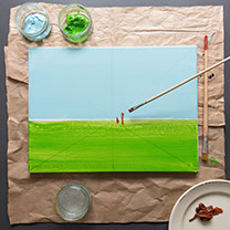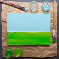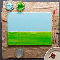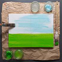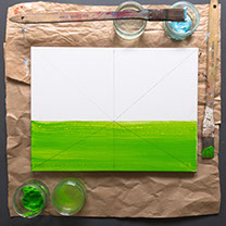 Schilder het onderste gedeelte van je landschap groen tot aan de horizonlijn. Gebruik hiervoor een brede kwast en verdun je verf ietsjes met water.
