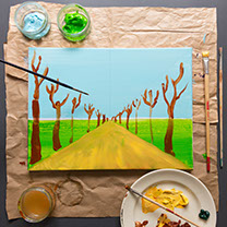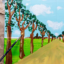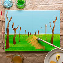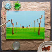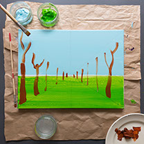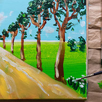 Werk de bomen verder uit met takken en bladeren. Schilder de bladeren niet te dicht zodat de blauwe lucht er nog een beetje doorheen schemert.