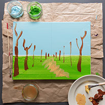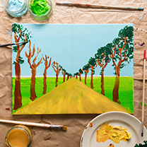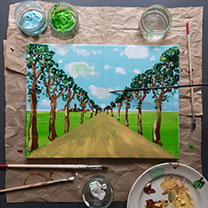 Ga verder met je landschap. Kijk naar het voorbeeld. Je ziet een dorp in de verte, een vogel in de lucht, wat bloemetjes in de berm en lichtval op de boomstammen en bladeren. Je kan er natuurlijk van alles nog bij verzinnen maar hou je aan het perspectief.