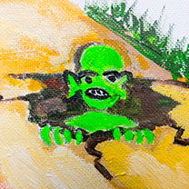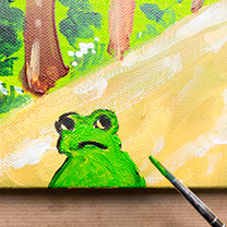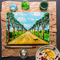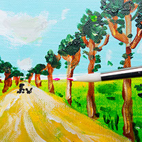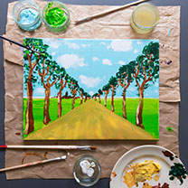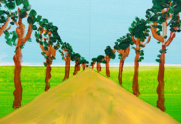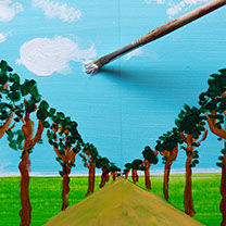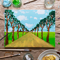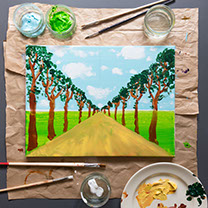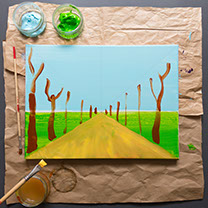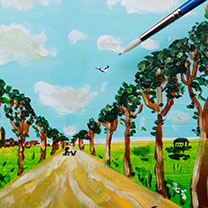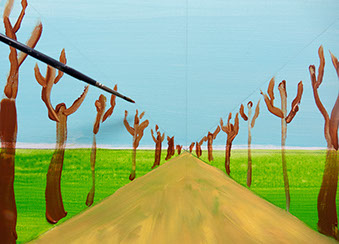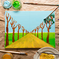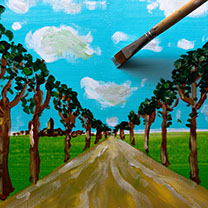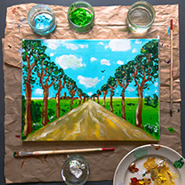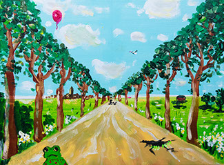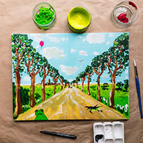 Perspectief in jouw schilderij bereik je niet alleen door lijnen maar ook door wat in de verte is kleiner af te beelden. En zie je die rode sportwagen op de weg aan de horizon? Nu je toch rode verf aan je penseel hebt kun je ook een ballon door de lucht laten zweven. Loopt er in jouw schilderij een figuurtje richting het verdwijnpunt dan is het sowieso kleiner dan een kikker op de voorgrond. Waar denk je trouwens dat de kikker bang voor is? In de lucht komt een ooievaar aanvliegen. Je kan de wolken ook een beetje grijze schaduw geven voor nog meer diepte in jouw schilderij.