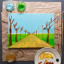 Maak een ongewoon perspectief, schilder een gat in de weg. Wat komt eruit klimmen? Een postbode of een vreemd aardmannetje? Gebruik je fantasie.