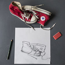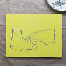Terwijl je verf droogt maak je een schets van jouw schoenen met potlood op papier. Denk erover na naar welke kant je de schoenneuzen laat wijzen.