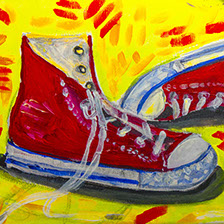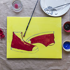 Schilder met grijze verf je schoenen op je gekleurde ondergrond aan de hand van je schets. Geef je schoenen daarna een kleur. Wees niet bang dat alles precies moet lijken. Je kan met streepjes werken net zoals Vincent. Schilder lekker verder.