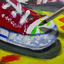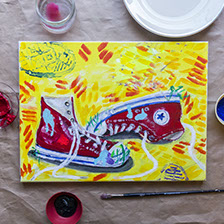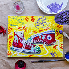 Laat een schoen over je schilderij lopen. Kwast lichtjes wat verf onder de zool. En druk het dan af op je kunstwerk. Let op, wel je zool niet vergeten schoon te maken. Anders krijg je ook nog een kinderstreek op het tapijt thuis!