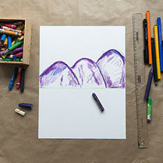 Teken met paars en blauw krijt drie bergen achter elkaar. Je kan hard en zacht drukken met je krijtjes voor verschillende effecten