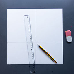 Trek met potlood en een liniaal op een vierkant stuk papier een verticale lijn door het midden.