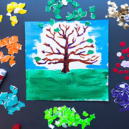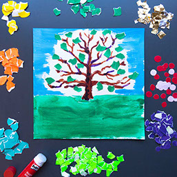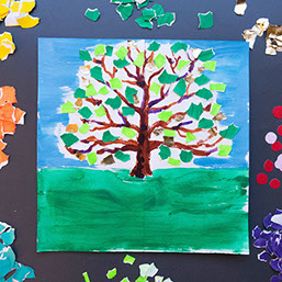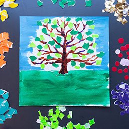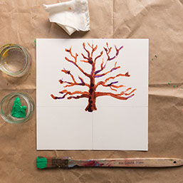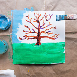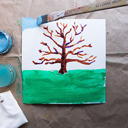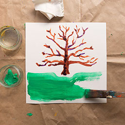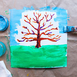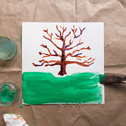 Leg pakpapier of kranten onder je werkstuk en ga verder. Schilder eerst het grasveld groen en daarna een lichtblauwe lucht om de takken heen. Laat het wit tussen de takken open.