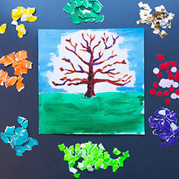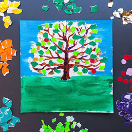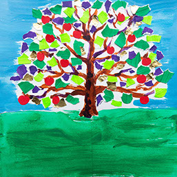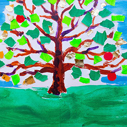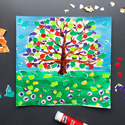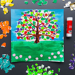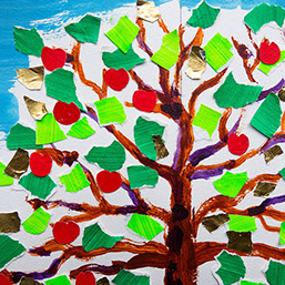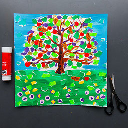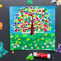 Geef je boom groene boomblaadjes en rode appels. Plak de snippers vast.